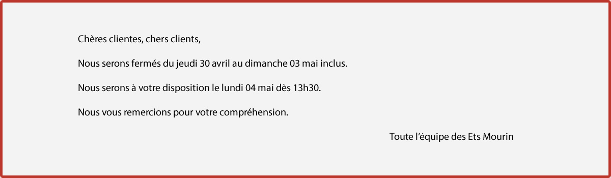Lundi : 13h30 - 17h00Mardi au vendredi : 08h15 à 12h00 - 13h30 à 18h00Samedi : 08h15 - 12h00