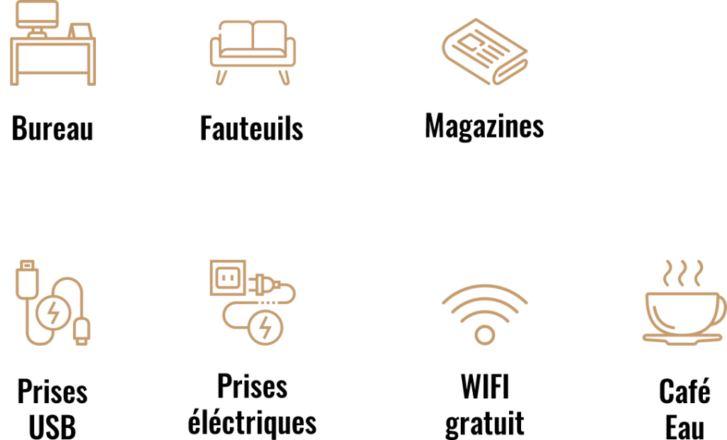 Et pour ceux ou celles qui voudraient profiter de ce moment pour travailler, notre espace d’attente est bien équipé. Nous mettons à votre disposition un bureau avec connexion internet haut débit gratuite, prises USB et prises électriques.